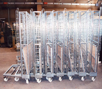 Composto da una base con 2 ruote fisse e 2 ruote girevoli ø 100 mm. in polipropilene nero, da quattro pareti e da un coperchio con maglia rete mm. 50x50.